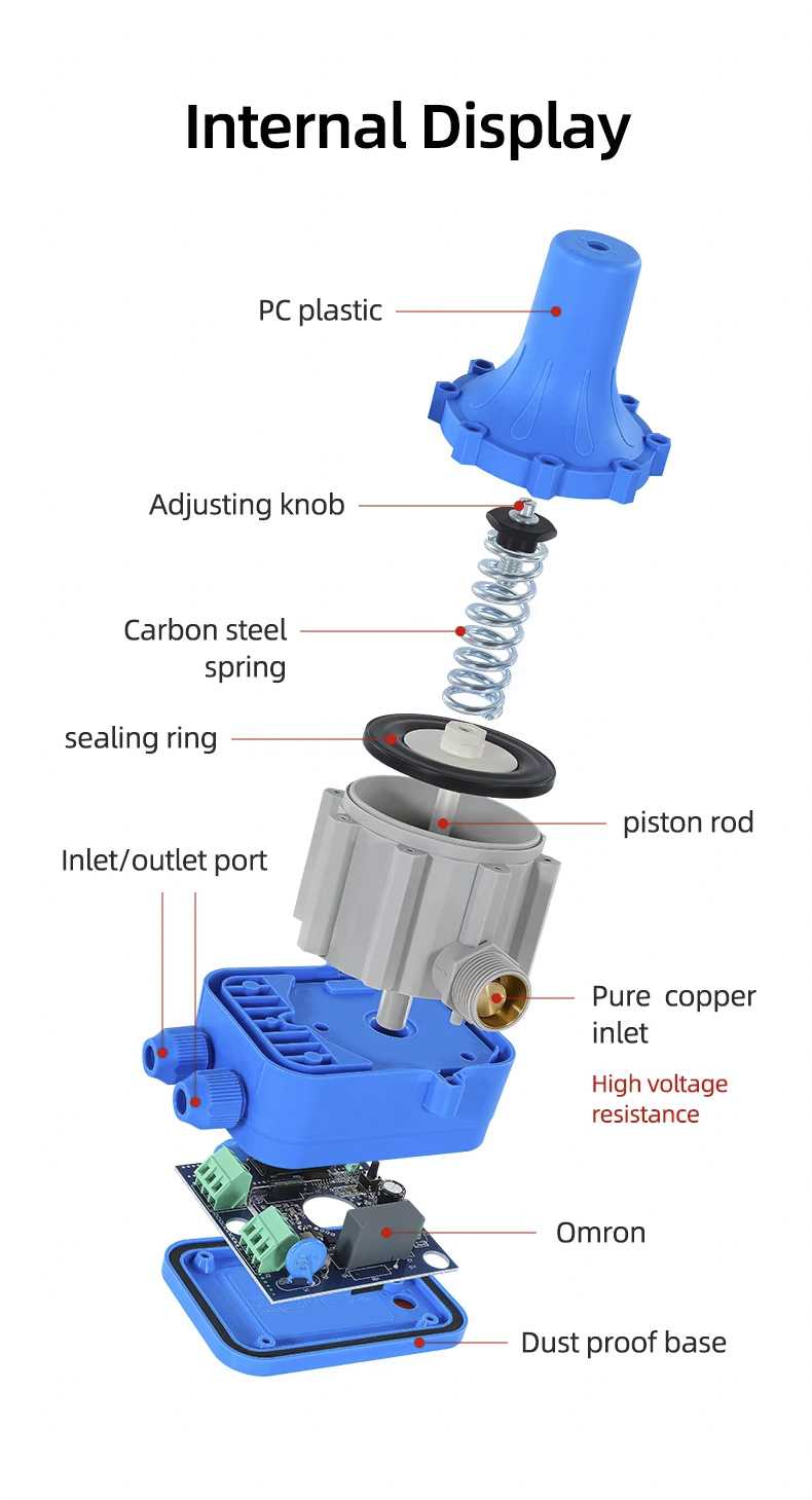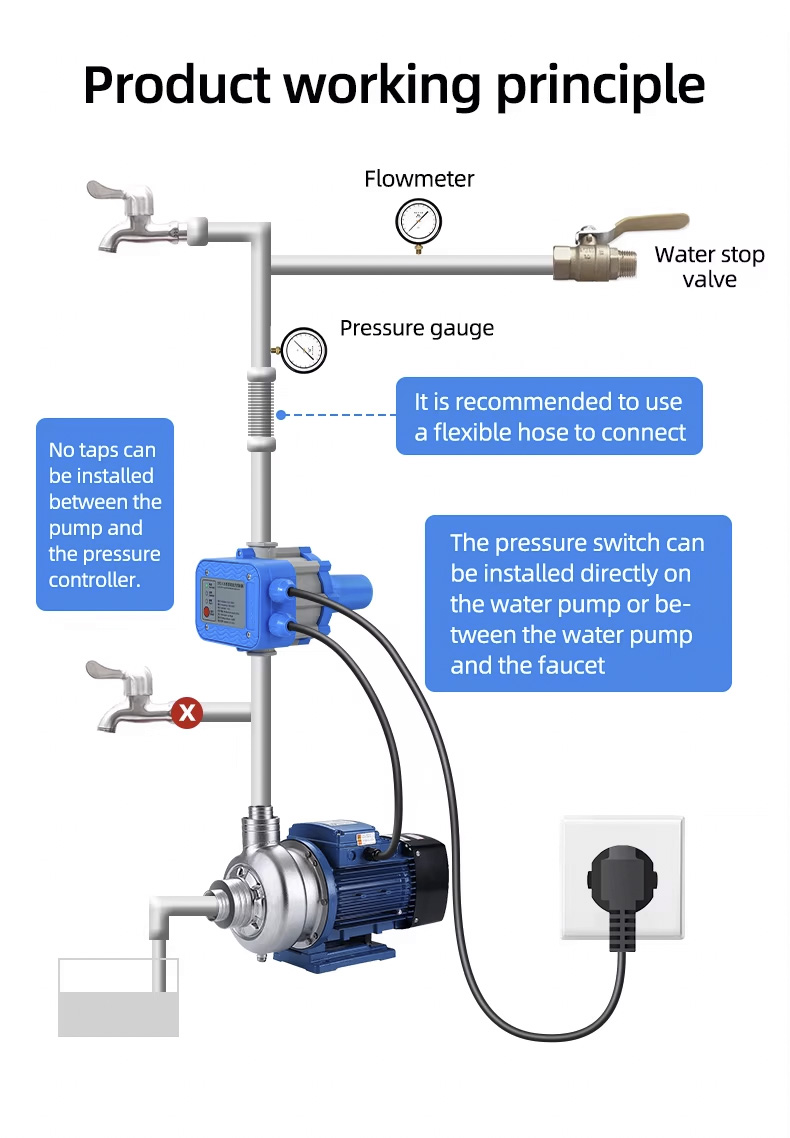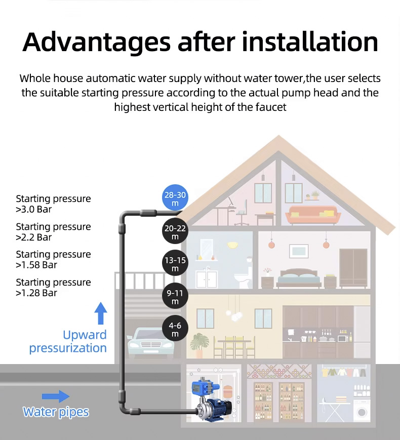 Automatisk pumpekontroller Vannpumpe elektronisk trykkregulator kan erstatte de kompliserte installasjonene til automatisk vannpumpe. Den har funksjonene stabil ytelse, lavt vedlikehold og lang levetid.