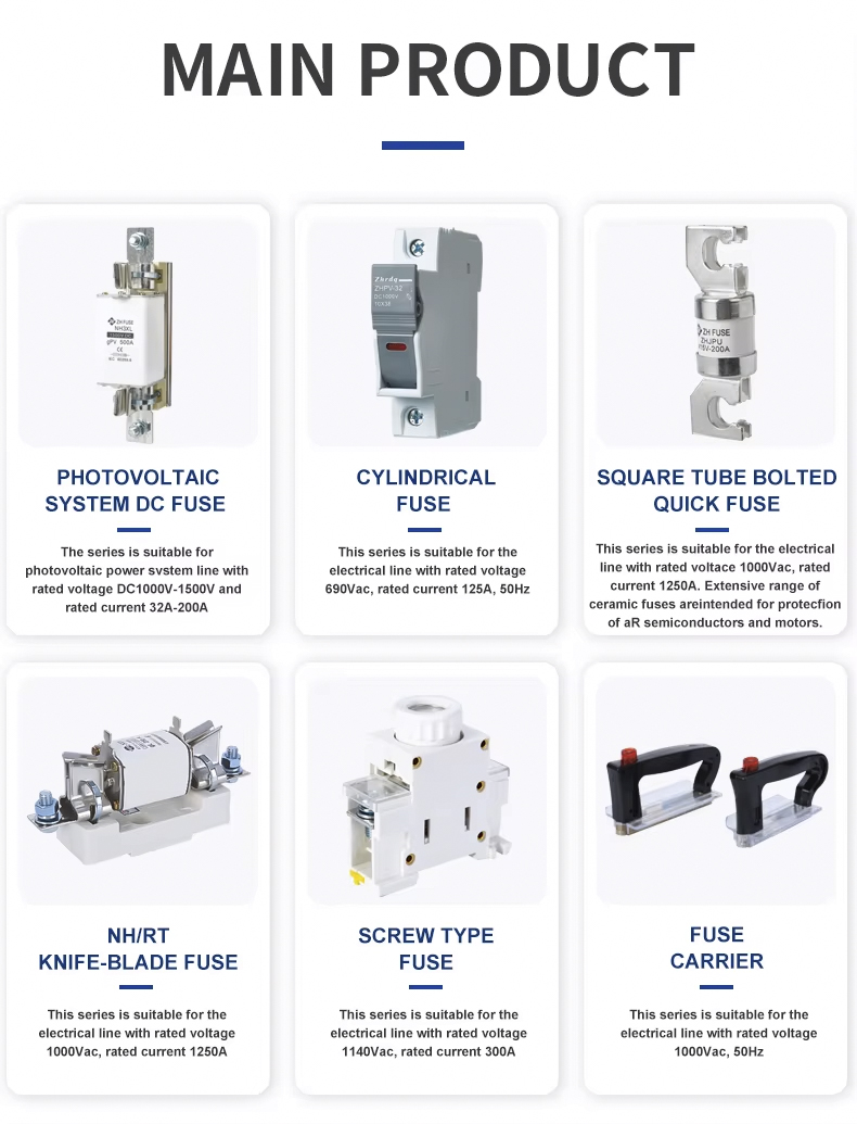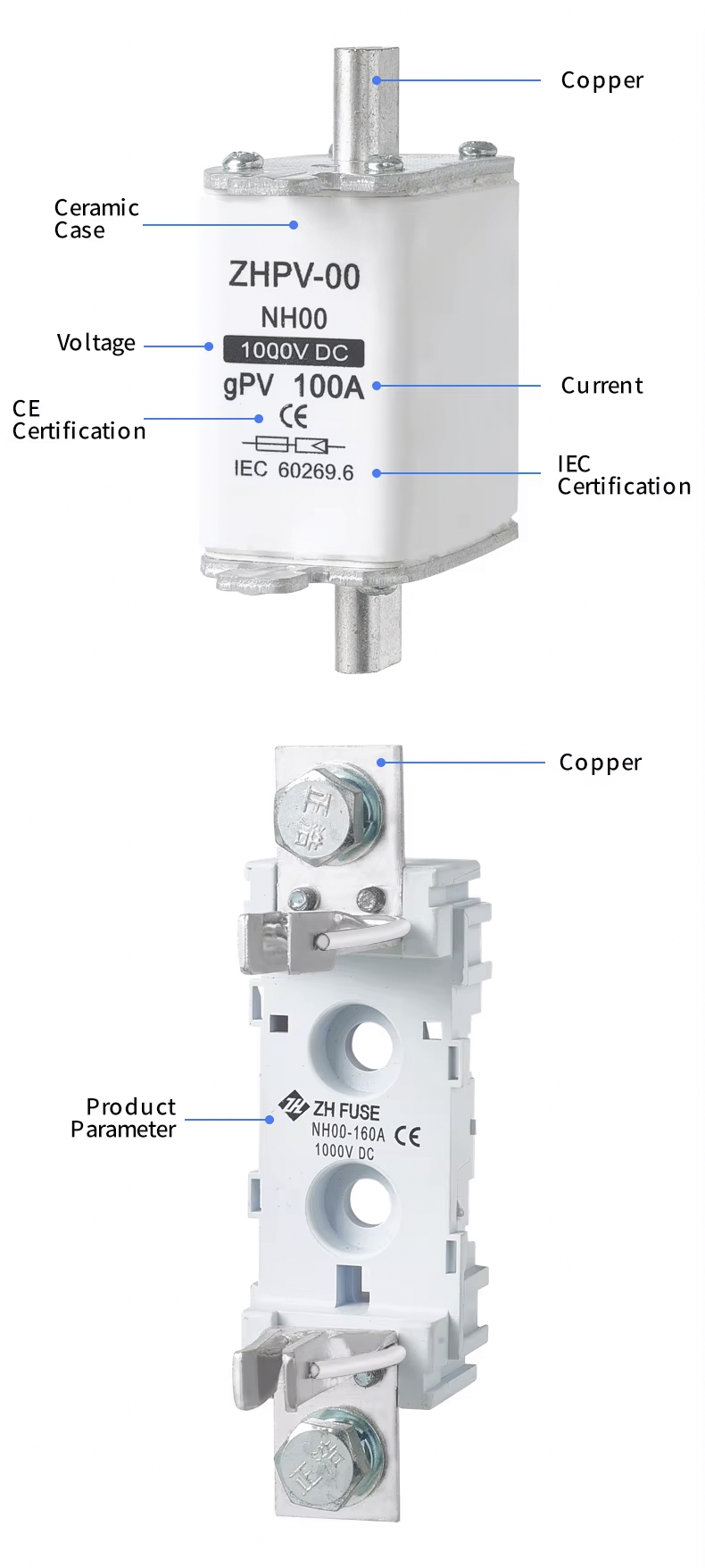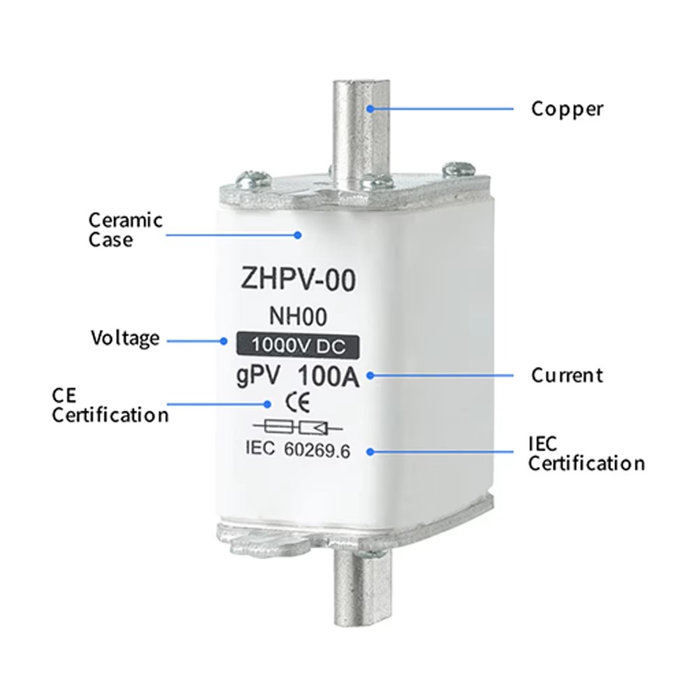 NH00 solcelleanlegg DC 1000V 32~100A Fuse Link Høykvalitetsmaterialer er valgt for å sikre stabile og pålitelige sikringsegenskaper, rask responshastighet og høy sikkerhet. Kompakt i utseende, enkel å installere, mye brukt i ulike systemer som fotovoltaiske kombineringsbokser, vekselrettere og DC-fordelingsskap. NH00 Photovoltaic System DC 1000V 32~100A Fuse Link har bestått flere internasjonale sertifiseringer og overholder IEC-standarder, noe som gjør det til et ideelt valg for å sikre sikker drift av kraftverksystemer.