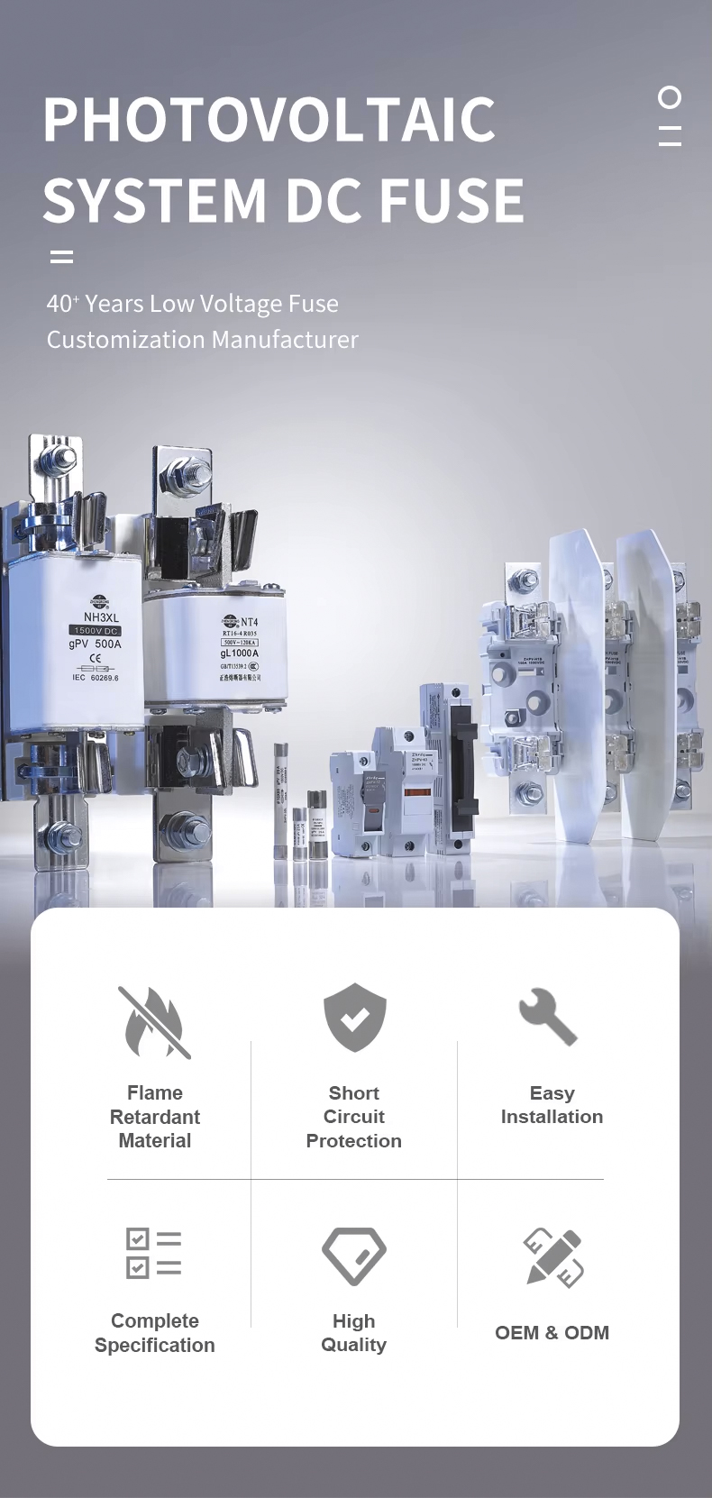 NH00 Photovoltaic System DC 1000V 32~100A Fuse Link er egnet for overstrømsbeskyttelse i fotovoltaiske DC-systemer. Dette produktet støtter en maksimal spenning på 1000V DC og et strømområde på 32~100A. Den er designet spesielt for solenergianlegg og energilagringssystemer, og kan effektivt forhindre skade på utstyr forårsaket av overbelastning eller kortslutning.