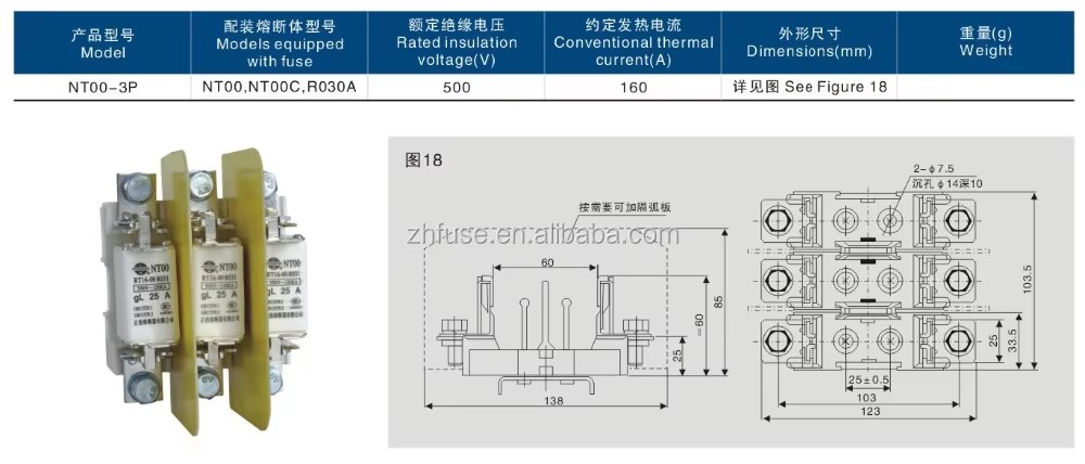 Denne serien med sikringer består av en sikringslenke og en sikringsholder. NT00-3p sikringsbase er laget av høy styrke keramisk gulv eller harpikslov med høy temperatur, med kileformede sammensatte statiske kontakter. Det er en åpen struktur med god varmeavledning, høy mekanisk styrke, pålitelig forbindelse og enkel drift. NT00-3P sikringsbase er kompatibel med denne serien, og NH-sikringskremmer brukes til å fjerne sikringen fra basen. Sikringslenken laget av rent kobber eller sølvark (eller sølvtråd) er forseglet i et smelterør laget av keramikk med høy styrke.