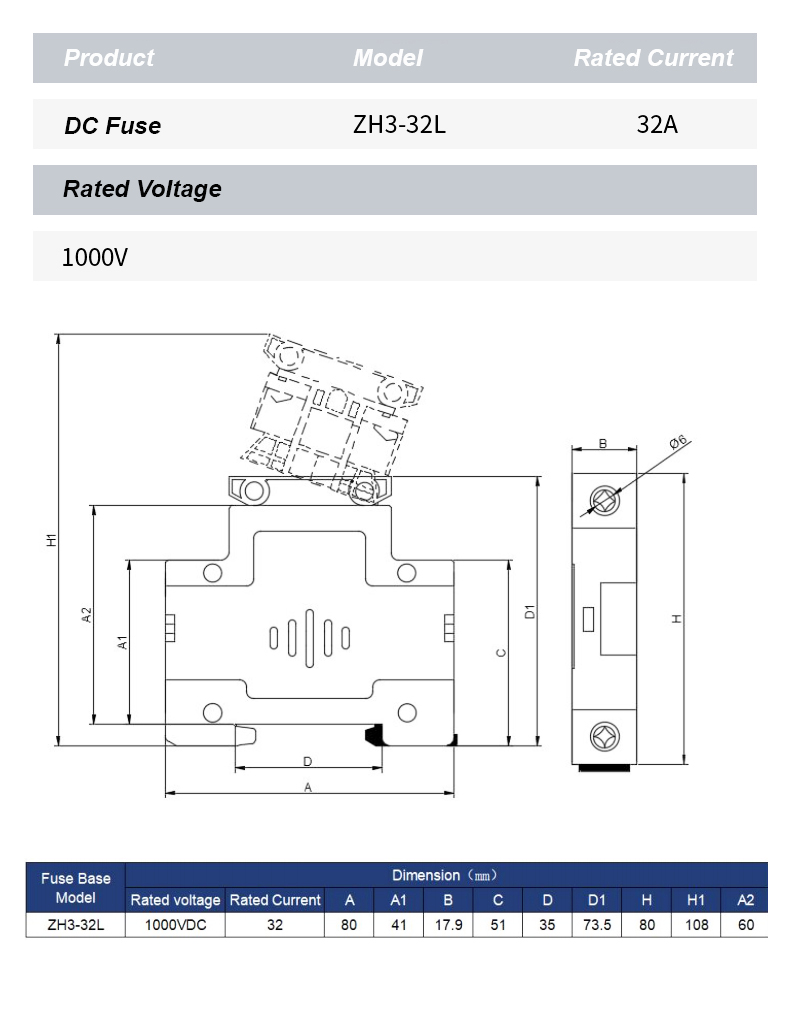 ZH32L DC 1000V sikringsholder er en høyytelseskomponent designet for å sikre pålitelig beskyttelse for elektriske kretser i solcelleanlegg og andre likestrømsapplikasjoner. Med robust konstruksjon og overlegen isolasjon, er ZH32L DC 1000V sikringsholder egnet for trygt å huse sikringer vurdert opp til 1000V DC, og forhindrer effektivt overstrøm og kortslutningsskader.